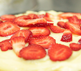 Ingredientes: farinha de trigo, ovos, leite, açúcar, margarina, fermento em pó e chocolate em pó. Recheio: chocolate com pedaços de morango, cobertura de chocolate, granulado e morangos.
